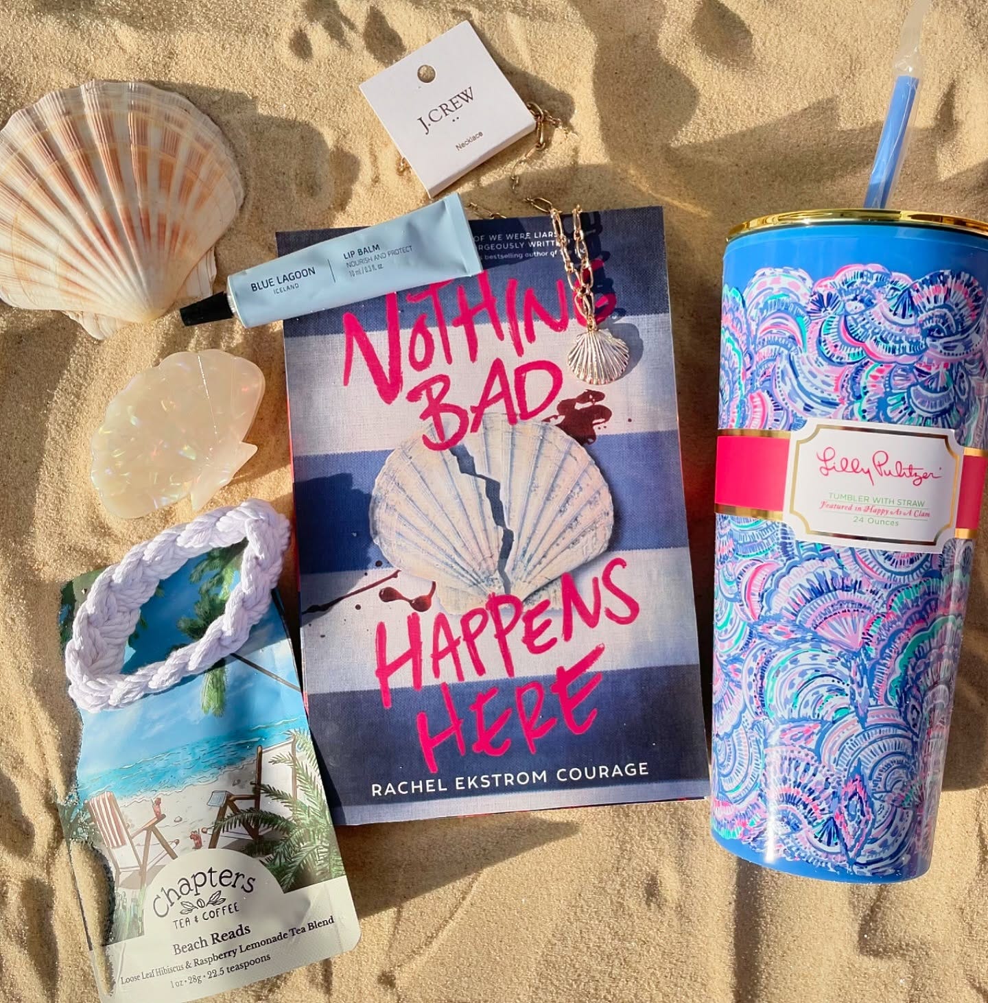 Speaking of which, if you preorder Nothing Bad Happens Here from Murder by the Book in Houston, TX or RJ Julia in Madison, CT (both stores ship anywhere in the US), you’ll be entered for a chance to win a prize pack including a Lilly Pulitzer travel cup, J. Crew Factory seashell necklace and hair clip, Blue Lagoon lip balm (honestly the best in the world!), Chapters brand tea, a sticker, bookstore merch, and a sailor knot rope bracelet. And even if you don’t win, you’ll get a personalized, signed copy with a custom sticker (designed by Nick!) and a bookmark with each purchase.